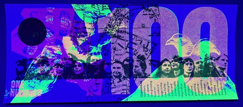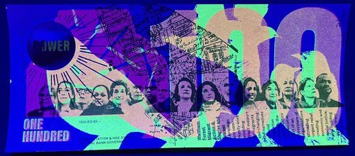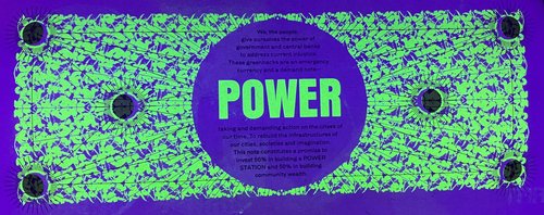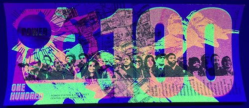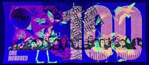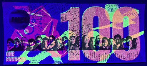 The Greenback 100’s are riso printed in black and layered fluoro pink and fluoro yellow and have a gold holographic foil sun feature. The radiating lines of the sun grow as the denomination increases.