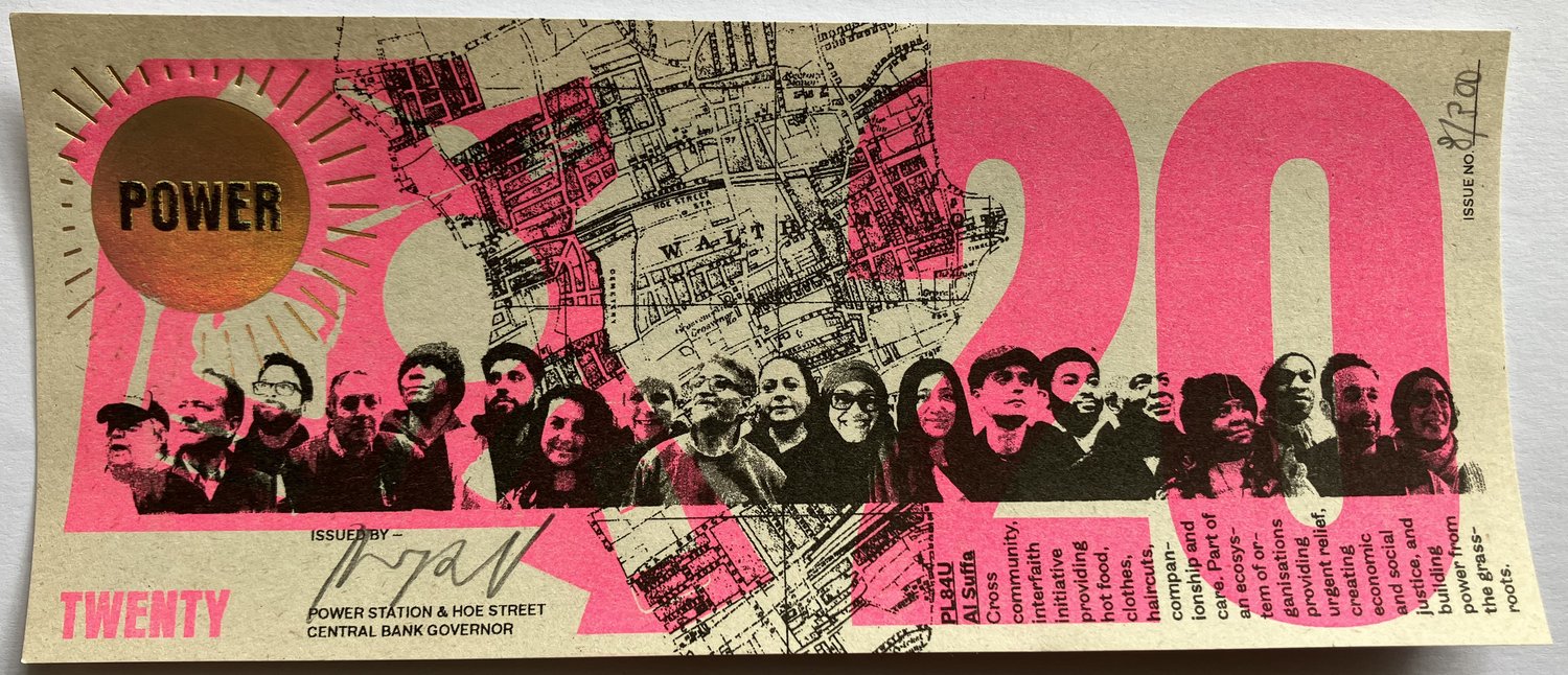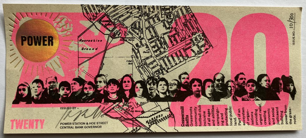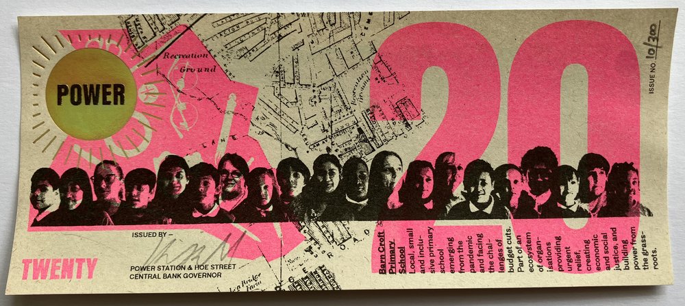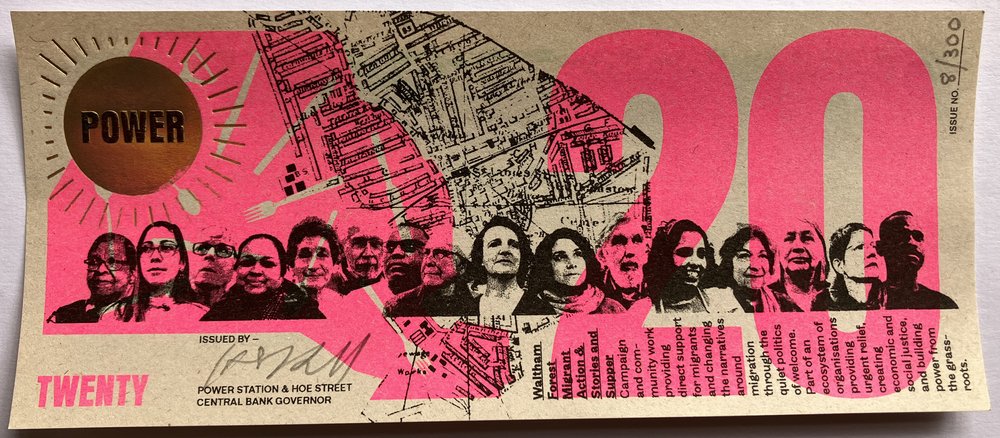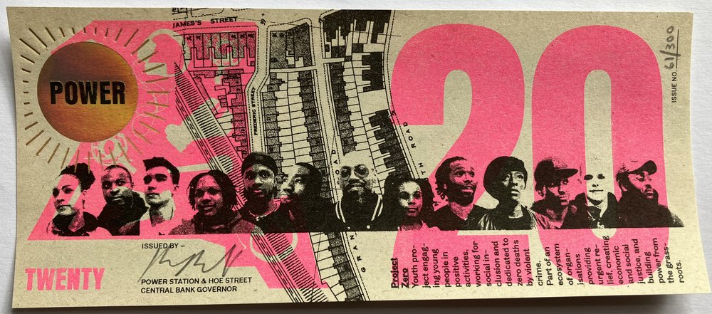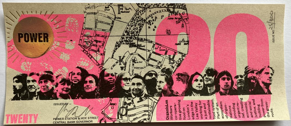 All Greenbacks were made in public in May 2022 in Walthamstow, North East London by a team of local people trained in riso printing, uv ink screen printing and foil blocking.
