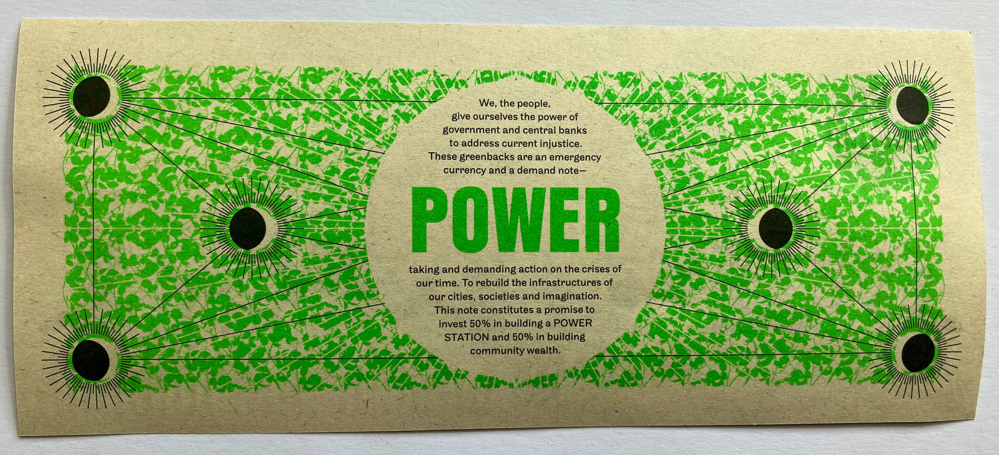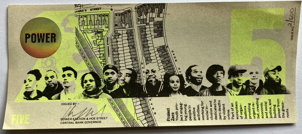 All Greenbacks were made in public in May 2022 in Walthamstow, North East London by a team of local people trained in riso printing, uv ink screen printing and foil blocking.